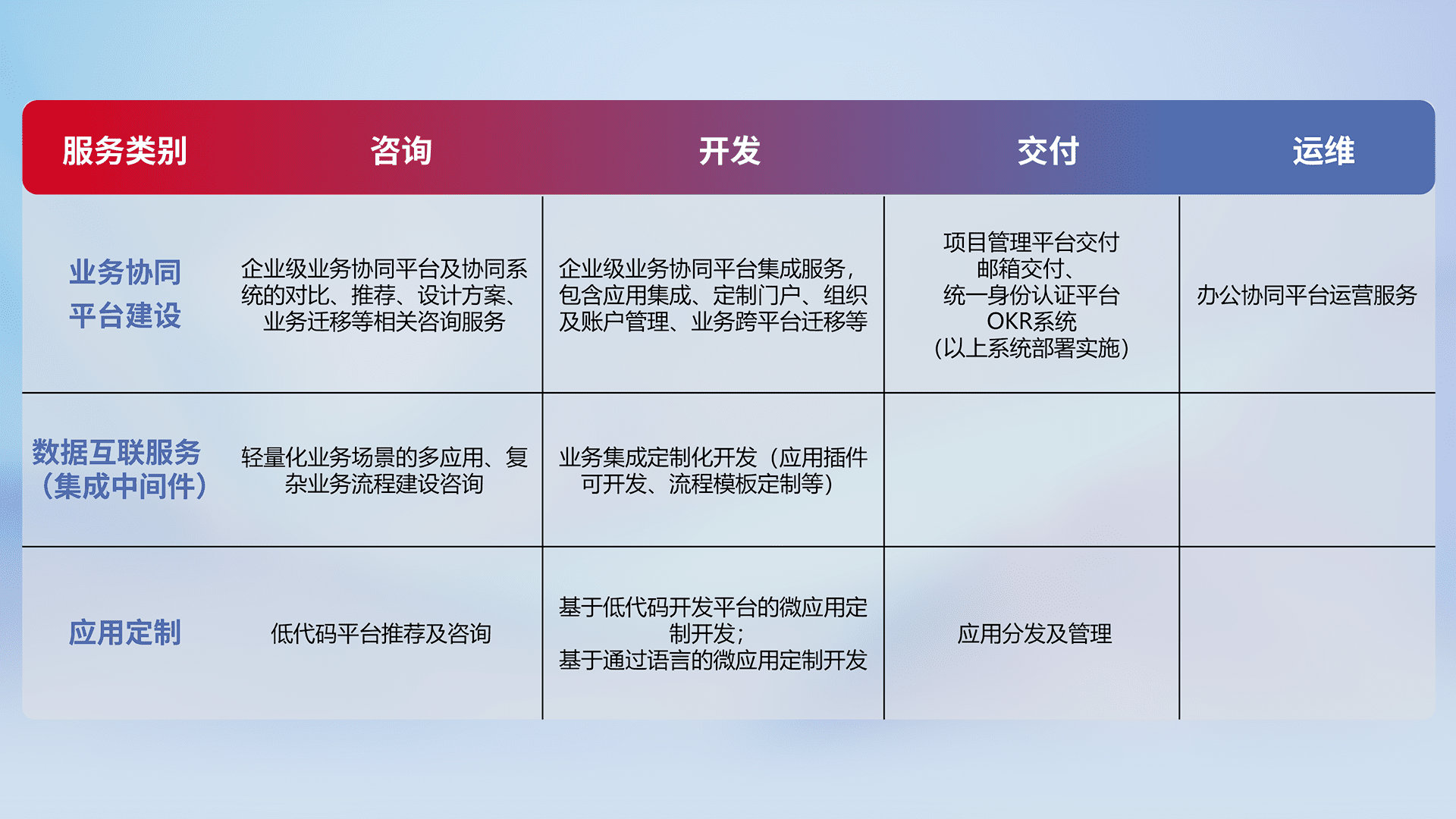 针对钉钉、、企微、、、、IDaas等平台级产品提供产品的规划、、、、方案、、、交付、、定制化开发等服务,,实现如统一协同办公、、、智能客户服务、、混合会议管理、、、智能数据查询、、等业务场景,,,,实现数字化转型。。。