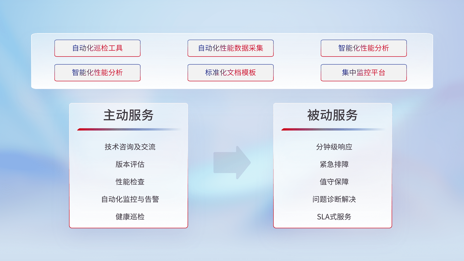 智能化工具和标准化文档,,,保障服务质量,,,,提供主动服务(包含技术咨询、、、版本评估、、、、性能检查、、、、自动化监控与告警、、健康巡检)和被动服务包含(分钟级响应、、紧急排障、、、值守保障、、、、问题诊断解决、、、、SLA服务)。。。。